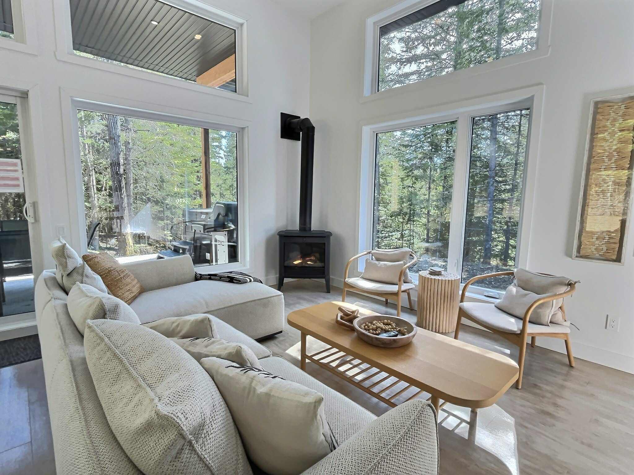 A chalet surrounded by forest . Every space has been thoughtfully designed to warmly welcome families and friends. Large windows flood the interior with natural light and offer a soothing view of the forest, where feathered and four-legged visitors a...